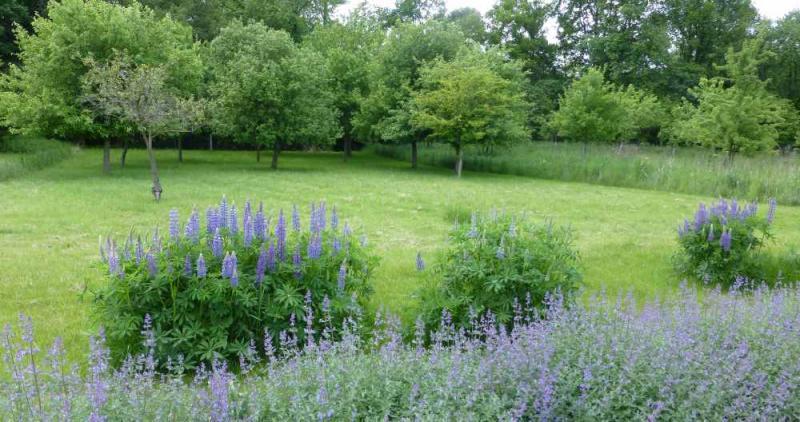 Pearl,auf unserer Obststreuwiese, in der sich Wühlmäuse, Maulwürfe und Rehe wohlfühlen, blüht im Frühjahr in der Zwischenzeit massenweise das Wiesenschaumkraut. Hier warte ich immer, bis die Pflanzen Samen gebildet haben, bevor ich die Wiese mähe. Die meisten Stauden, die ich dort eingepflanzt habe, werden leider von den Rehen immer wieder abgefressen, sodass die Pflanzen sich nicht gut entwickeln können und schon gar nicht blühen. Die blauen Lupinen bleiben aber verschont und entwickeln sich immer prächtiger. Diese habe ich einfach als Jungpflanzen in die Wiese gepflanzt und mähe immer um die Pflanzen herum. Nach der Blüte werden sie aber einmal mit einer Heckenschere abgeschnitten und dieser Teil, der dann auch hohe Gräser enthält, wird ebenfalls einmal gemäht. Die Lupinen treiben dann wieder neu aus.Viele GrüßeElke