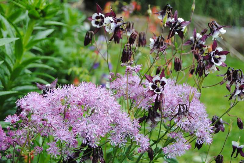 Mein T. delavayi habe ich als winzigen Sämling bekommen, heuer, im 3. Jahr, hat es sich quer über eine große Rose gelegt, das sah hübsch aus, besonders jetzt, als das Laub goldgelb geworden war. Es steht von Anfang an durchgehend im Beet im Wiener Hofgarten. Am Kamp wächst T. aquilegiifolium