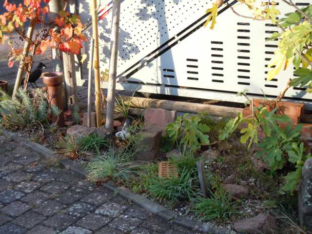 Auf der Südwestseite des Carport mein trockenstes und wärmstes Beet im Garten mit diversen wilden Bartiris, Crithmum maritimum und 2 Feigen. Die grünen Büschel sind Ipheion uniflorum.