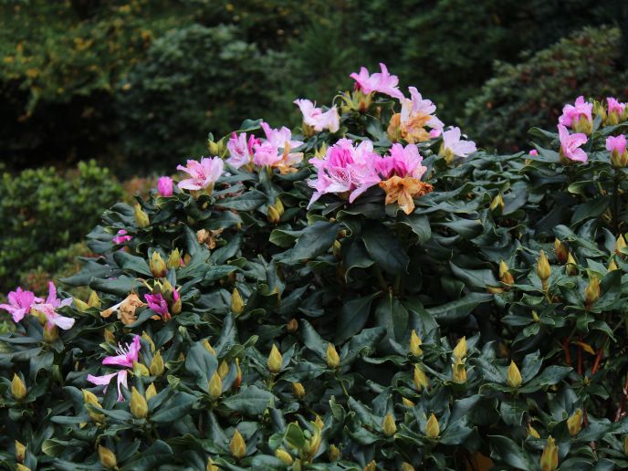 Schwer zu erkennen? Gehört das Laub dazu?Es gibt übrigens auch Rhododendron-Sorten, die ausdrücklich als "herbstblühend" beworben werden wie z.B. 'Herbstzauber', 'Herbstfreude' und 'Weinlese'. Die im Herbst sich öffnenden Blüten sind natürlich für die Frühjahresblüte verloren.Welcher könnte es sein? (Schild war nicht zu finden, das Gehölz stand tiefer in einer ganzen Gruppe und es regnete ).