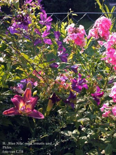 Hemerocallis 'Blue Nile' blüht seit vielen Jahren in meinem Garten.Es ist eine robuste und winterharte Pflanze, aber leider nicht immer so gut geöffnet und fleckenlos wie auf dem Link oben.Selbst habe ich kein Einzelfoto, sondern sie ist auf dem Foto nur in Kombination zu sehen.
