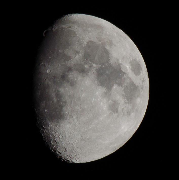Heute morgen hab ich noch mal den halben, abnehmenden Mond eingefangen (Ausschnitt und geschärft, sonst nicht nachbearb.). Er stand ziemlich senkrecht über mir und ich musste die Kamera am seitlichen Dachfensterrahmen auflegen. Ein nachvollziehbares "Oben" und "Unten" gibt 's unter solchen Bedingungen natürlich nicht mehr.
