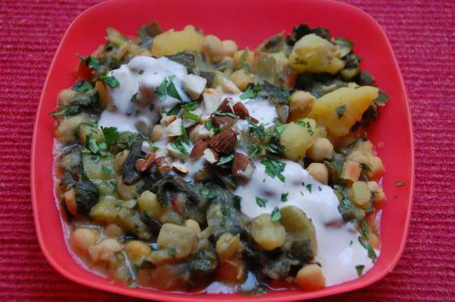 Bei Schratis Treffen wäre ich wohl auch gern gewesen, Lieschen. :DAella, feine Sachen hast Du da gekocht. Sehr schön.(Gestern war ich am Nachmittag und Abend noch sehr lange beruflich unterwegs, deshalb hier ein)Nachtrag zu Montag:Mangold-Kartoffel-Curry aus Mangold, Zwiebel, Knoblauch, Chili, Ingwer, Garam Masala, Senfsamen, Kreuzkümmel, Kurkuma, Kardamom, Kartoffeln, Kichererbsen. Dazu ein Yoghurt-Tomatenmark-Koriander-Dip und geröstete Mandeln.