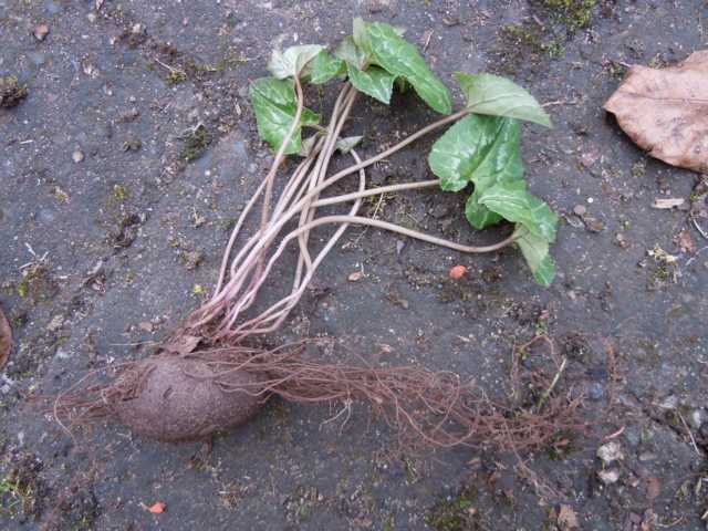 Leider hab ich kein besseres Foto. Hier die Pflanze vor dem einsetzen. Es kann eigentlich nur C. hederifolium sein. Die Blattunterseiten sind nicht rötlich. Die Blattränder sind jedoch nicht glatt wie bei meinen anderen C. hederifolium, sondern gezahnt bzw. gesägt.Die Wurzeln sind an der Knollenoberseite.Ich bin gespannt, wie sie mal blüht. Rosa nehm ich an.
