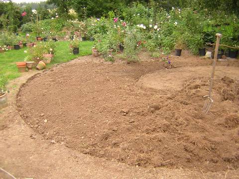 Auf der Gegenseite ist das "fette Eckbeet" entstanden, was eine enorme Fläche hat, was hier auf dem Foto allerdings klein aussiehtGanz vorne rechts auf dem Bild ist das rund, der sogenannten Rosenschnecke.