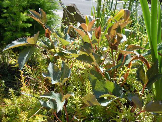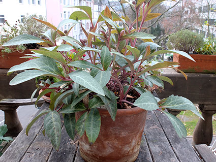 So in etwa schaut H. x sternii mit der Zeit aus. Die robustesten Sämlinge setzen sich durch und sie wird automatisch der H. argutifolius ähnlicher, behält bei mir aber die Färbung der Blätter. Die "Zähne" sind aber mit der Zeit ausgeprägter.