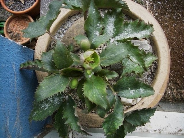 So in etwa schaut H. x sternii mit der Zeit aus. Die robustesten Sämlinge setzen sich durch und sie wird automatisch der H. argutifolius ähnlicher, behält bei mir aber die Färbung der Blätter. Die "Zähne" sind aber mit der Zeit ausgeprägter.