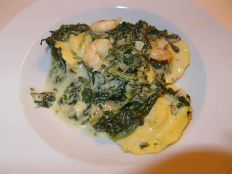 und gestern mascarponegefüllte ravioli mit blattspinat und garnelen, dazu wieder salatherzen, dieses mal mit tomaten....