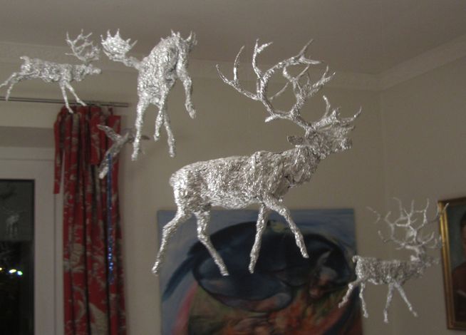 Meine Liebste hat mir ein Zugeständnis gemacht ich muss keinen Baum schmücken.Die Tiere die diesen Baum in vergangenen Jahren geschmückt haben schweben jetzt unter der Decke.Euch allen ein besinnliches Fest oder auch frischfröhlich,wenn es euch lieber ist.Bei mir also ohne BaumOb wir einige Kugeln dazwischen scheben lassen wissen wir noch nicht.