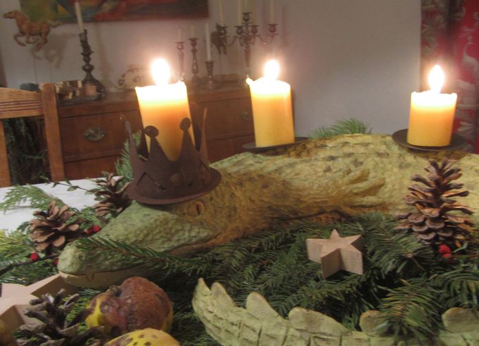 ....ein stimmungsvolles Foto EmmaCampamula!Gibt es das Adventskrokodil in diesem Jahr noch, Axel?Hier wurde aus Zeitmangel fast nichts dekoriert. Ein paar Kiefernzapfen und jeden Tagen ein weiteres nostalgisches Figürchen (die erbte ich vor langer Zeit von meiner Großmutter). Unser Nachbarkind darf bei uns auch jeden Tag ein Adventstürchen öffnen und dann ist die Kleine immer ganz aufgeregt, wenn sie ein neues Püppchen entdeckt und sie etwas damit spielen darf.