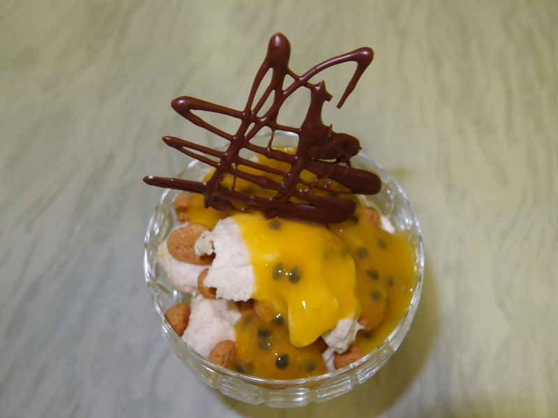 und zum nachtisch cheesecakecreme mit amarettini und mangomaracujasoße