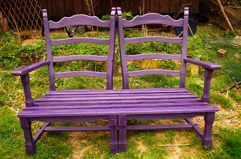 Bei unserem Einzug fand ich im Garten zwei fast verrottete Wohnzimmersessel vor.Nicht gerade das Design, das ich mir ins Wohnzimmer stellen würde, Eiche rustikal, auch Düsseldorfer Spätbarock genannt.Beiden Stühlen fehlte bereits eine Armlehne, sie waren abgefallen und im Gras verkompostiert.Eine Gartenbank wollte ich haben und sah die beiden Stuhlleichen an. Überlegte, Eiche ist ja eigentlich recht haltbar...Nun habe ich die Dinger gereinigt, neu verleimt und geschraubt. Das Holz in Ordnung gebracht und Latten für die Sitzfläche gekauft.Das Endprodukt gefällt mir gut, die Bank wird noch ein paar Jahre halten.