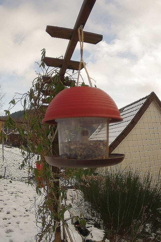Sehr gute Idee, danke.Gerade, wenn man nicht täglich das Silo auffüllen kann.In meinem Futterhaus habe ich eine ähnliche Konstruktion aus einer 1,5 Liter Colaflasche mit einem Deckel aus einem Fleischsalat-Schälchen.Nicht schön, aber praktisch.Deine Eimer kann man ja noch mit einem Dach aus Schilfmatte oder Stroh verschönern, und als schweren Deckel könnte man auch einen Tonuntersetzer in passender Größe besorgen.
