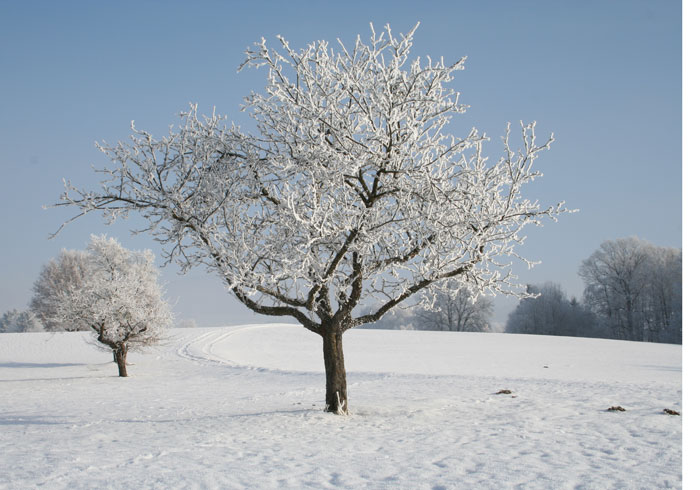 Beim nächsten Bild gefällt mir persönlich nicht, dass ich die Baumspitze rasiert hab. Ein dämlicher Straßenposten ist auch zu sehen und der kleine Baum klebt nach meinem Empfinden zu sehr am großen. Aber ich wollte euch die Raureif-Birke nicht vorenthalten.