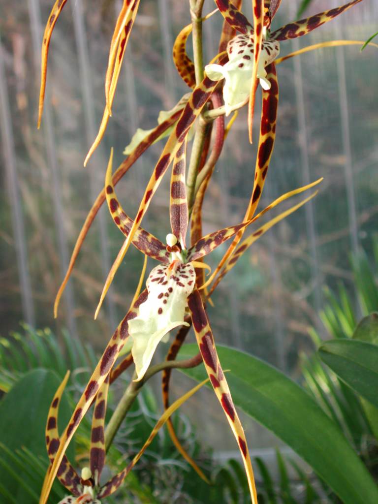 In derselbe Gruppe gehören auch die Brassia-Arten mit ihren lang ausgezogenen Blütenblättern. Die meisten Arten mögen es leicht wärmer als die der Gattung Odontoglossum. Sie kreuzen aber ebenfalls in die anderen Gattungen ein und bilden dann so etwas wie Odontobrassia oder Miltassia = Brassia x Miltonia. Hier Brassia Rex.