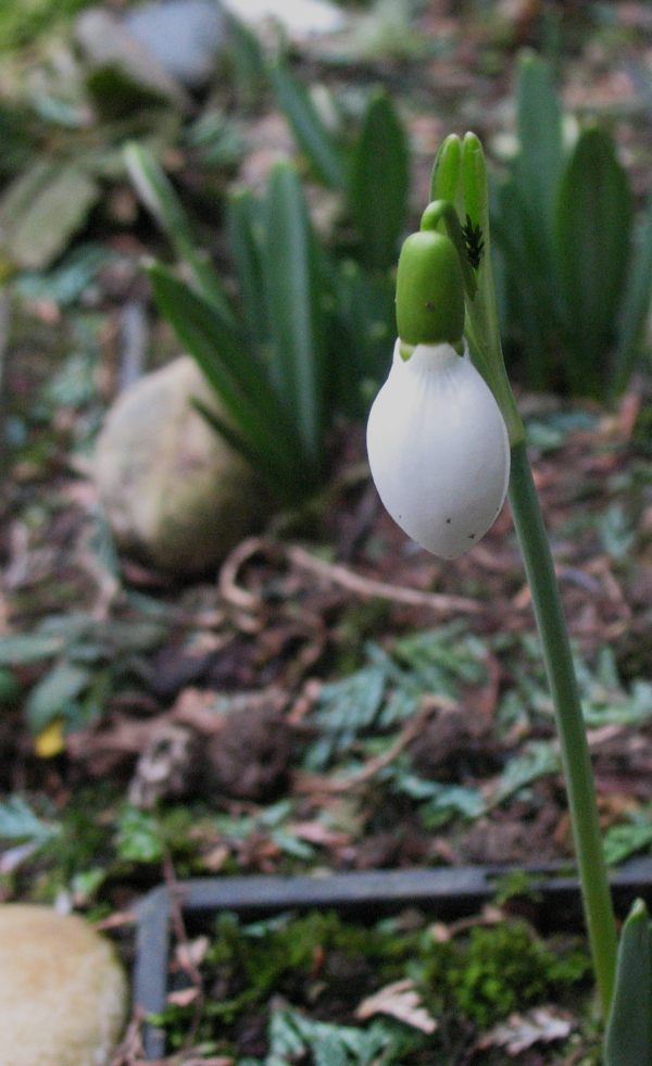 ...und dagegen ein Winzling, Galanthus nivalis 'Blewbury Tart', der sich bei mir nur schwer einlebt, aber in diesem ajahr gibt es drei Blüten und die sind anscheinend auch kräftig.