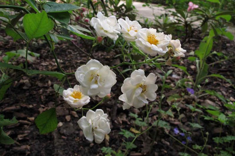 Felicia, ebenfalls Moschata, hat im Rosenbeet anfangs gut geblüht, aber die Verhältnisse setzten ihr doch ganz schön zu: