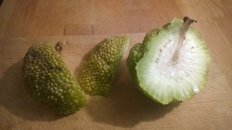 Also ich habe die Frucht probiert. Riecht ganz interessant. Saft klebrig milchig, Geschmack etwas gurkig.. Scheint nicht giftig zu sein. 8)Aber ich habe nur ein wenig vom Fruchtfleisch gekostet weil ich mir unsicher wurde ob das wirklich eßbar ist. Laut Literatur nicht eßbar.ich habe sie dann abends gegoogelt.Die Samen schmecken wie Sonnenblumenkerne. Hörnchen sollen regelmäßig die Samen ernten.Angeblich soll der Duft Moskitos vertreiben. Wir hatten in Rom einige Früchte im Zimmer liegen und an mir haben sie nicht gesaugt. Ist natürlich kein Beweis.Aber das Trennen der auch in der Literatur als eßbar genannten Samen vom Fruchtfleisch ist mühsam.Es sind aber viele Samen die auch wie geschälte Sonnenblumenkerne aussehen. Bei einer Hungersnot würde ich sie ernten.