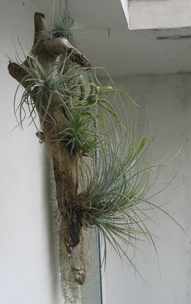 Mit meinem Sohn habe ich in einem Bach alte Hölzer gesucht, die man gut aufhängen kann, dann grosszügig Löcher hineingebohrt und nach und nach mit Tillandsien bestückt. Sie brauchen nicht so regelmässige Pflege, können mit der Spritzflasche gewässert werden und werden jedes Jahr schöner.