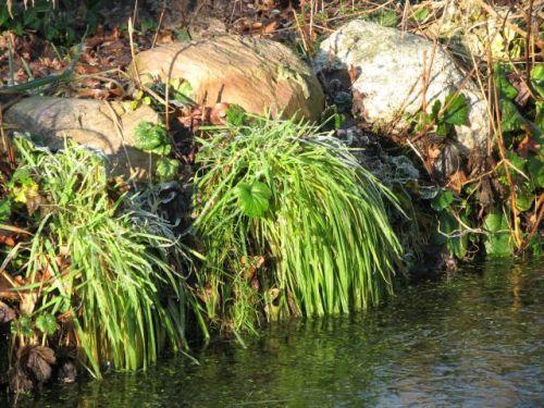 Einen nicht angelegten Naturteich/tümpel gibt es hier auch im neuen Garten.Ist garnicht so klein, wie er von oben wirkt, vielleicht 15x7m (ist hergezoomt, der Hang ist relativ hoch und steil)Eigentlich gefällt es mir so ganz ursprünglich und ich möchte nicht sehr viel ändern, die Fauna dort unten ist sehr vielfältig, ein Gequake in den unterschiedlichsten Tönen und Stimmen im Frühjahr, dazu Schlangen, verschiedene Libellen...Einzig stört mich etwas der harte Grasbewuchs, der die offene Seite ziemlich einnimmt und den Zugang versperrt (sieht aus wie Schnittlauch, ganz dunkelgrün aber sehr hart, steht im sumpfigen Randbereich, aber auch etwas ausserhalb, was könnte das sein?)Den würde ich gerne teilweise entfernen und vielleicht durch etwas Blühendes ergänzen.Gibt es da Möglichkeiten, mit denen ich das ökologische Gleichgewicht nicht zu sehr störe, evtl. sogar bereichere?Leider habe ich bisher nur dieses Ausschnittbild vom Sommer