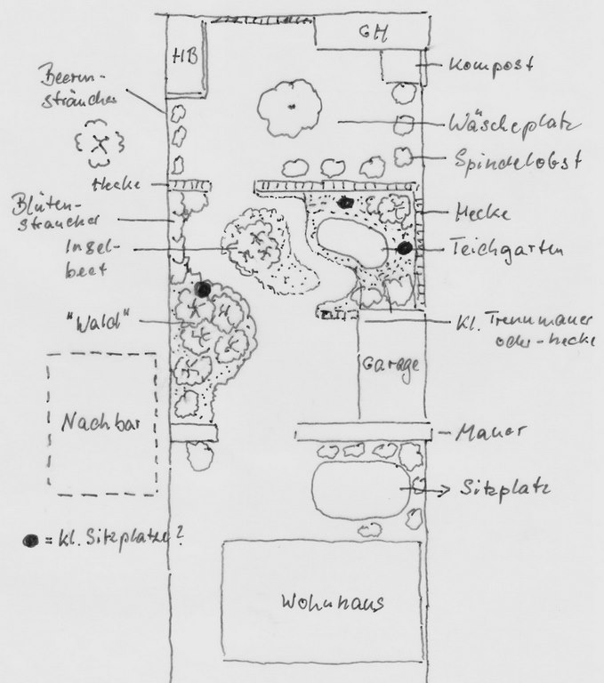 Für mich braucht der der "Wald" links unten in Teil 2 auch rechts einen Gegenpol außer Birke und Bluthasel auch in deinem Garten!Denk mal über einen Sorbus nach. Da gibt es viele schöne mittelgroße Baume in Sorten, die gut zur Kulisse Birke und Bluthasel passen könnten, nicht allzu viel Laub produzieren (Stichwort "Teich" und auch gut unterpflanzbar sind.Auf der linken Seite würde ich gerne die Länge der Grenze zwischen "Wald" und dem Hochbeet wissen.Das hintere Ende ist Süden. Im Teil eins hat das Nachbarhaus keine Fenster, da gäbe es niemanden, der gucken kann.Tei2 rechts ist zwar voller Büsche, aber den einzigen hohen Baum, die Kirsche musste ich fällen lassen, da die sonst bald von allein umgefallen wäre.Problematisch sind da eher die rückwertigen Fenster des linken Hauses, zumal da der eine oder andere Blödmann wohnt (3. Bild in #21, rechts, da bräuchte ich viele hohe Bäume)