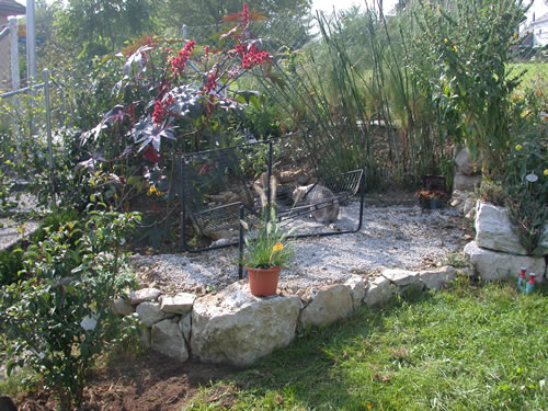 Ist wirklich eine schöne Ecke: Kann von dort über den ganzen Garten sehen in den zwei Minuten, die ich mir gelegentlich zum hier sitzen abreisse. Den Rizinus habe ich gepflanzt, damit er mir ein wenig Rückendeckung gibt gegen aussen. Der Garten ist erst zwei bis drei jährig und so habe ich eigentlich noch keine Ecke wo mein Garten nicht einsichtig ist. Es sind Bruchsteine von der Terassenstützmauer. Das Bänkli habe ich in einem Brockenhaus gefunden, ist Wind und Wetter ausgesetzt und sieht immer schön einladend aus und die Katzen gehen auch nicht drauf. Hier kommt dann noch ein Rosenbogen vor die Steine. Die Rose "Penelope" habe ich im Herbst gepflanzt.LG marcir