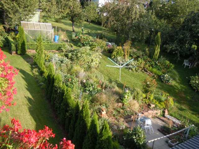 Das ist auch für mich in meinem Garten eigentlich die Hauptaufgabe der gemähten Flächen.Und sie sorgen, wenn ich will und kurz vorher mähe, für Ordnung im Garten. Staudo hat das am Anfang mal angesprochen.Vom Nachbarbalkon sieht das dann für meine Verhältnisse sehr ordentlich aus. Ohne Brille könnte man das, wenn man denn will, dann schon für einen englischen Rasen halten...Für mich kommt dieser Garten aus vielen ganz unterschiedlichen Versatzstücken der Gartenkultur bisher jedoch nicht ohne die gemähten Flächen als trennendes und gleichzeitig verbindendes Element aus...