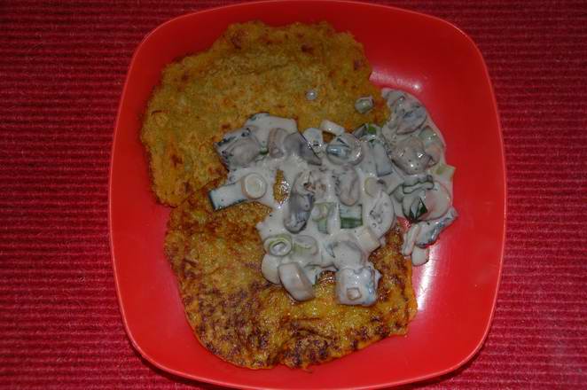 Bei mir gab es Möhrenkartoffelpuffer mit Rahmchampis (Champignons, Frühlingszwiebel, Sahne, Schmand, Montrealsteakpfeffer).Wahlweise, für meine großen Ferienkinder, auch mit Zucker.