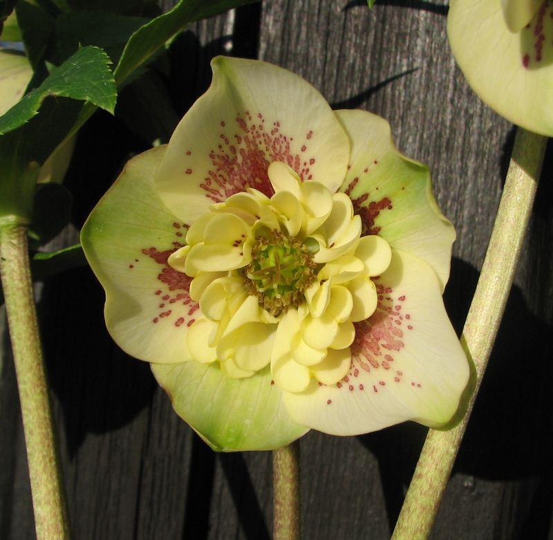 die früheste Helleborus Orientalis bei mir. Eine erste Blüte, noch lädiert vom Frost. Wegen der weinroten Nektarien habe ich sie. Eine schwarzrote mit grünen Nektarien steht in der Nähe.