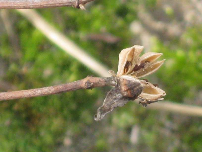 Zweig.Den Gesamthabitus konnte ich nicht mehr aufnehmen, der Strauch war schon runtergesäbelt. Ein Zweig steht in der Vase und zeigt bereits etwas Grün.Philadelphus war ein Gedanke, aber der in meinem Garten hat seine Früchte nicht so auseinandergespreizt, sondern kugelig zusammen.