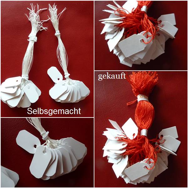 Wie versprochen, hier sind meine Schildchen. Im Vergleich - die selbstgebastelte aus Plastik und die gekaufte aus Pappe. Sie sind cca. 2,5 x 1,5 cm groß .