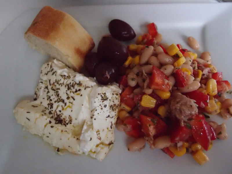 gestern gabs schafskäse aus dem ofen mit salat aus canellinibohnen, paprika, thunfisch und mais, dazu ein paar oliven und baguette