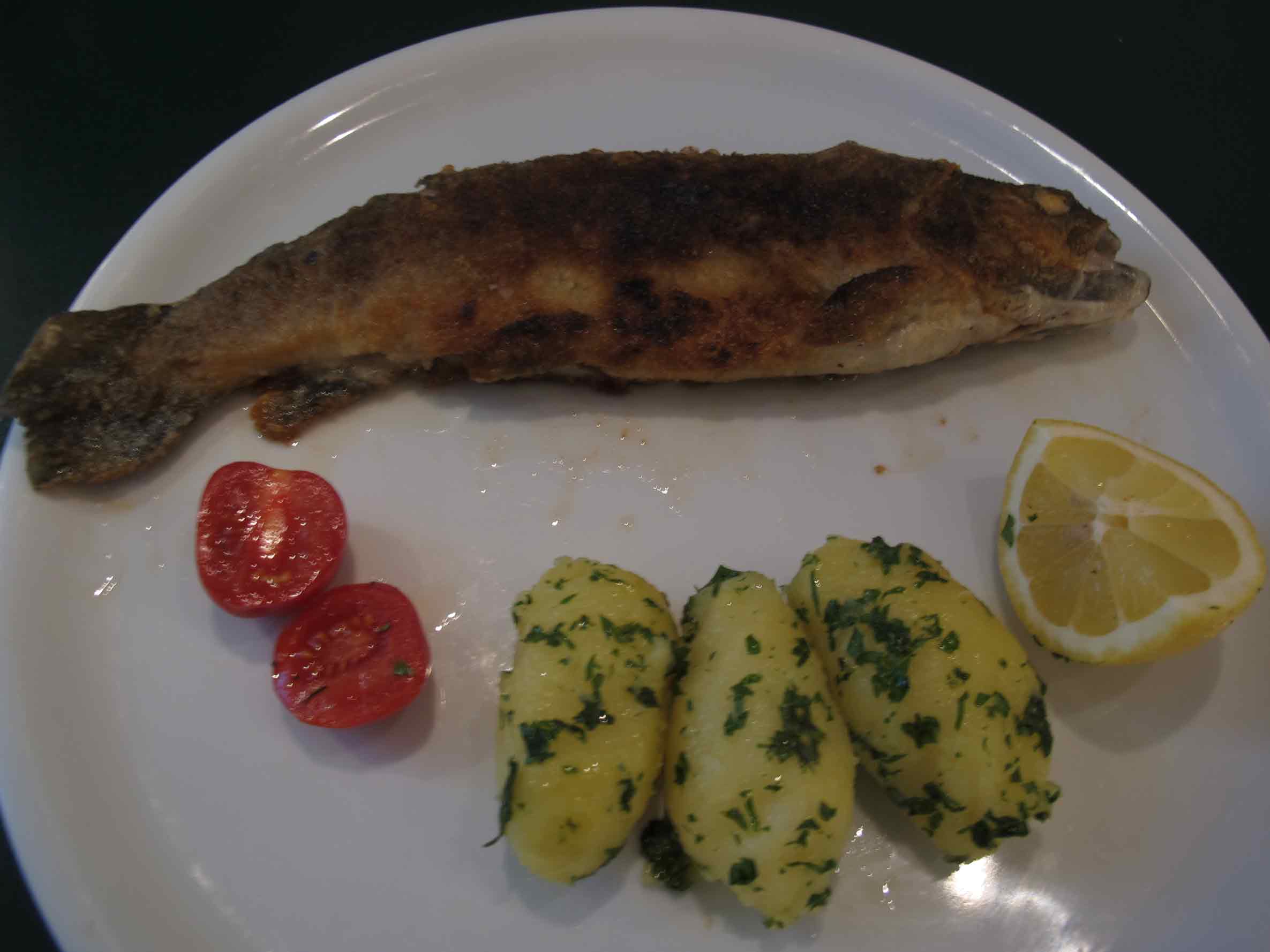 Anders als meins auf dem Teller: gebratene Forelle mit Petersilkartoffeln, dazu Blattsalat. Der fertige Fisch läßt jegliche Ambition vergessen