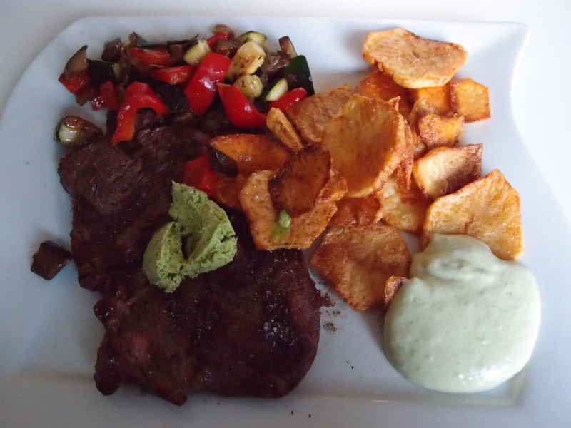 rindersteak mit bärlauchbutter (der hofladen hatte schon frischen bärlauch, ich konnte einfach nicht widerstehen :D ) frittierten kartoffelscheiben, gemüse aus zucchini, paprika und aubergine und avocadoquark. das hat alles so toll nach sommer geschmeckt :D