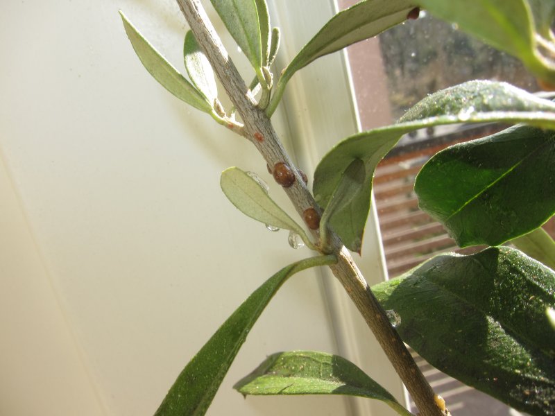 Seit zwei Jahren habe ich einen Olivenbaum, ca. 150 cm hoch, als Topfpflanze. Zwei Fragen beschäftigen mich derzeit:1. Seit einiger Zeit stelle ich eine zunehmende Anzahl brauner "Knubbel" auf der Unterseite der Blätter (siehe Foto, oberer Bildrand) und an den Zweigen fest. Wenn ich sie öffne, sind sie trocken, hohl und bis auf ein paar weiße Krümel leer. Wer kann mir sagen, worum es sich handelt? Ist das ein schädlicher Befall? Was sollte ich unternehmen? Und worum könnte es sich bei den klebrigen Tropfen handeln?2. Der Baum steht normalerweise auf dem Balkon (Südseite), kommt aber im Winter wegen Frostgefahr ins Zimmer und steht dann direkt hinter der Scheibe, bekommt also ausreichend Licht. Dennoch verliert er sehr viele Blätter (und zwar schon bevor der oben beschriebene Befall auftrat). Ich möchte ihn auch nicht ertränken. Übrigens triebt er durchaus neu aus, er ist also nicht am Eingehen. Woran könnte es also liegen, dass er so massiv Blätter abwirft? Gegossen wird er relativ sparsam - ist das möglicher Weise zu wenig? Vielen Dank für alle hiflreichen Antworten!