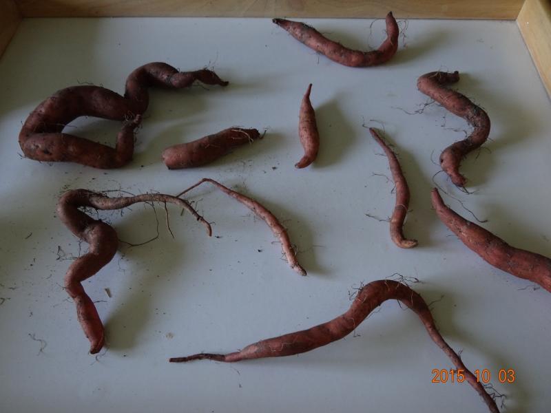 Gestern sah ich, dass der erste Frost meine Batatenpflanzen dahingerafft hatte. Also her mit der Grabegabel und geguckt, was sich den Sommer über im Boden getan hat. Zuerst an den aus Stecklingen gezogenen Pflanzen: Nix. jede Menge Wurzeln, keine Knollen. Dann an der Pflanze, die direkt aus der Mutterknolle gewachsen war: seltsam geformte Gebilde, die wenigstens an Bataten erinnern, aber Knollen sehen eigentlich auch anders aus