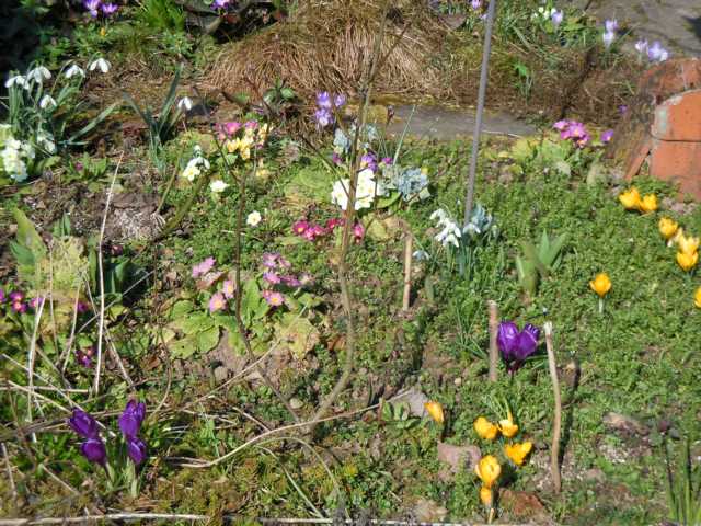 Bei mir sind noch einige mehr Lücken zwischen den FarbpunktenBild von heute vormittag. Primeln und Buntes. Der grüne "Rasen" ist Nigella. Die muss ich alle jäten