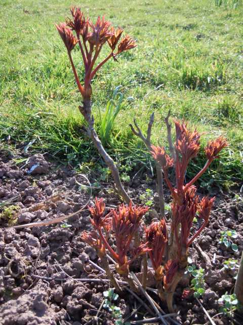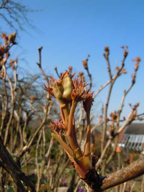 Mo Run Jue Lun. Strauchpfingstrosen als Blattschmuckpflanze. Bzw. im Moment Austriebsschmuckpflanze