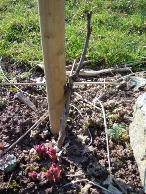 So schaut eine typische wüchsige Lutea-Hybride aus. Ein Jahr nach der (tiefen und schrägen) Pflanzung:Aus den unterirdisch liegenden Augen treiben Triebe nach oben und ergeben später einen mehrtriebigen Busch.Hier "Christine Héléne"