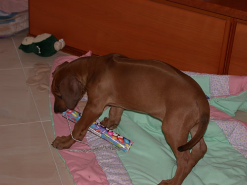 :)Ja ja, stimmt alles, herzig und knuddelig. Auch die spitzen Zähnchen, und die langen Nächte und die tausend Naturhäufchen und Pfützchen im vorher netten Wohnzimmer. Tücher, Zeitungen, Kothäufchen, Gummispielzeuge, umgefallene und mit Freuden ausgeräumte Papierkörbe möglichst platzausweitend ausgebreitet, Kabelsalat als Jagdherausforderung, Jacken- oder was auch für Aermel zur Einhängung und Trainierung der Zahnfixation. Und wenn es kalt ist draussen und Hundemama mit Leine winkt, Kopf in die Schachtel, "du siehst mich nicht, bin nicht da". Madame muss in den Garten getragen werden, eingekleidet in ein Wollmäntelchen, (welches nun bereits fast gesprengt wird) und mit einer dicken Wolldecke eingehüllt. Trotzdem ein erbärmliches Zittern und grosses Stirnrunzeln mit vorwurfsvollen Augen. Die Waschmaschine in Vollbetrieb, gespiesen mit vieler Pipiwäsche. Ja, endlich Ramba Zamba zu Hause. Aber schon am ersten Tag nach so wenigen Stunden, werden unsere Kinder auf der Strasse schwanzwedelnd und stürmisch begrüsst. Einfach unglaublich, wie Hunde schnell lernen. Auch die Katzen werden schwanzwedelnd begrüsst und mit Fauchen und Knurren beantwortet, da sich die beiden noch nicht auf die gleich Sprache geeinigt haben.