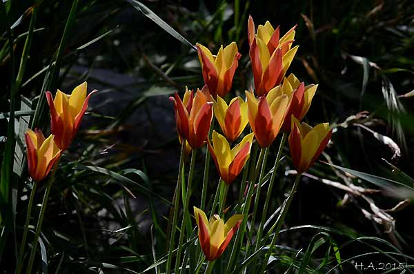 Das soll die Wildform von Tulipa kaufmanniana sein. Im Ramsch von Hoch bestellt, im November 2014 gepflanzt. Die Blüten sind die größten unter meinen Kaufmannianas. Naja, die wilden halt