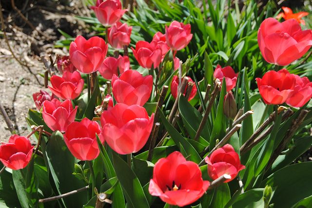 Die Nachbarn haben teils auch Tulpen. Meine "großen" (Purissima) im hinteren Gartenteil blühen üppig und wunderschön. Am Randstreifen, der noch zum Vorgarten gehört, blühen auch Tulpen, allerdings ebenfalls großblütige