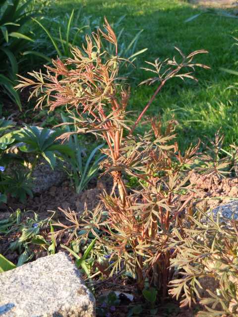 Auch, wenn sie sich etabliert haben, kann noch alles mögliche passieren und man weiß es nicht, was los war. Es gibt Phasen, wo sie wieder verschwinden. Dann tauchen sie wieder auf. Ich wunderte mich heute, dass 2 von den ursprünglichen 8 schwer um ihr Überleben kämpfen, in diesem wenig betreuten Gartenteil, in den ich sie 2005 gepflanzt habe. Es ist wahrscheinlich Hoki und Sentokujo. Eine Blüte erwarte ich erst mal nicht. Sie haben gerade neue Triebe gebildet, aus dem Boden. Die prächtigen Exemplare in manchen Gärten simulieren, dass die Kultur einfach wäre. Ist sie nicht. Hier im Hausgarten ist die Luft zu feucht, der Standort zu schattig und die Winter sind zu kalt. Im 10 Minuten entfernten Garten im Neckartal tuns die Paeonia Lutea und Paeonia delavayi ganz hervorragend. Die Paeonia Suffruticosa nicht so. Da muss ich was für tun.PS: niemals sollte man sich irritieren lassen durch Leute, die den Anschein erwecken, dass die Kultur von Päonien ein Kinderspiel sei. Sie haben selber schon einiges Lehrgeld oder Leergeld bezahlt. Oder wollen nur angeben.