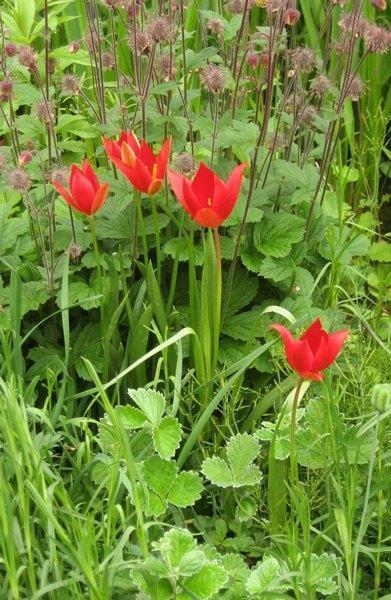 Tulipa sprengeriSie steht im anlehmigen Boden, vollsonnig (dahinter ein kleines Wasserbecken, daher Geum rivale ).2007 habe ich 2 Zwiebeln von privat erhalten, mittlerweile sind es 6. - Saatgut hat bei mir (daneben gestreut) bisher nicht funktioniert.Worin das Verwilderungspotential bestehen soll, kann ich auch nicht verstehen.
