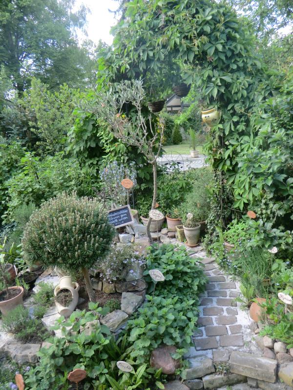 Als nächstes kam ich in einen ziemlich kleinen und kleinteilig angelegten Hausgarten. Der war schön, manchmal etwas kitschig, aber mit vielen Ideen :). Hier ein grüner Bogen direkt am Zaun. Dahinter ist der (übersichtlich gehaltene) Nachbargarten.