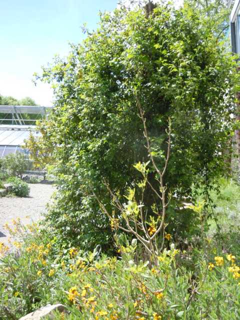 DIE Überraschung für mich:Pistacia vera im Freiland (schon ein paar Jahre, die Trachycarpus daneben haben die schweren Winter nicht gepackt), vor Rosa sempervirens.Zu Füßen ist Erysimum cheiri, der wilde Goldlack.