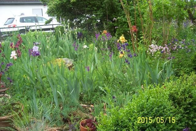 Das ist kleine ältere Beet mit den Verschollenen Iris. Das Bild ist leider etwas von der Sonne "verstrahlt"