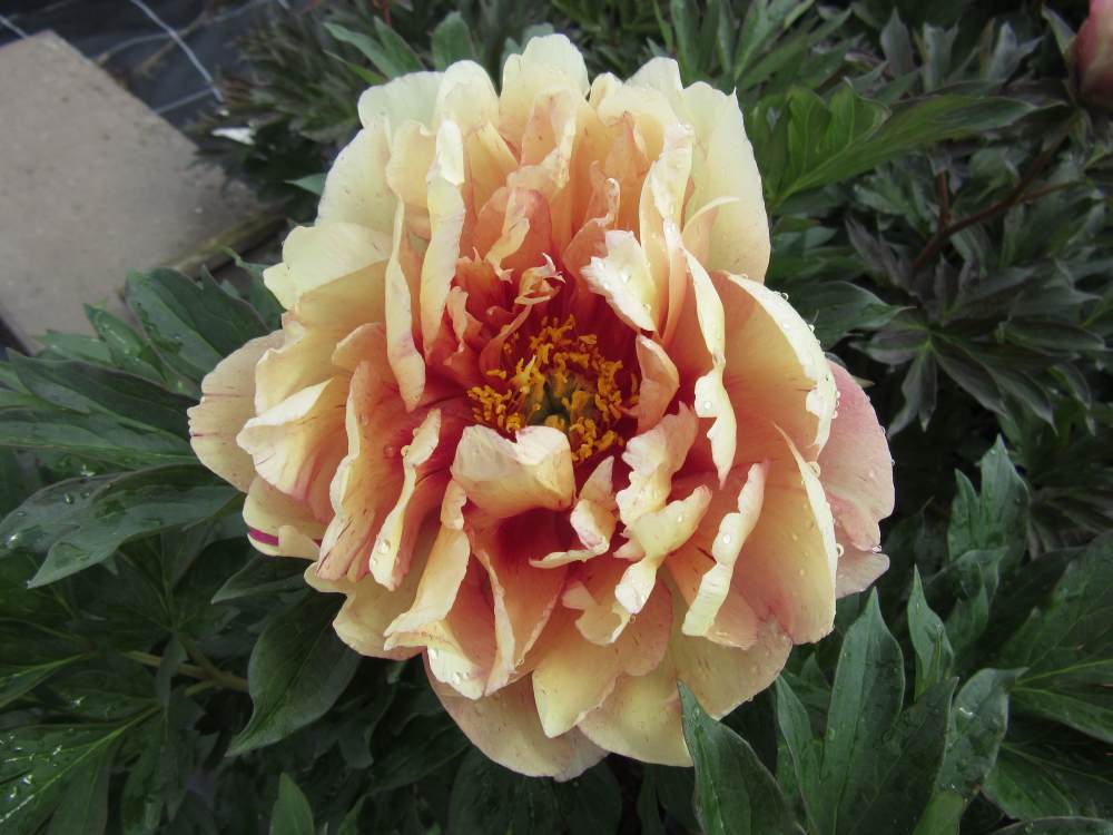 Hier ein Bild der vermeintlichen `Yellow Crown´, von der ich zwischenzeitlich gar nicht mehr so sicher bin, dass sie es wirklich ist. Den die Pflanzen sind eigentlich doch eher strauchpaeonienartig, die Blüten kommen fast ausschließlich an verholzten alten Trieben, neues wird eher sporadisch gebildet. Die Pflanze ist +/- 50cm hoch, also recht niedrig, die Riesenblüten nicken deutlich unter das Laub, auch keine Eigenschaft für die die Itohs der ersten Generation bekannt sind, oder doch ?Das Bild zeigt nicht meine Pflanze, diese ist noch zu jung, aber eines ihrer Geschwister.Ich habe schon längere Zeit eine Namenlose, vermutlich ist es `Yellow Crown´,