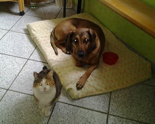 Barbara, alles Gute für euch zwei, pass auf dich auf!Katrin - du hast eine Schönheit. Und ich habe heute mal fotografiert, wie das aussieht, wenn die beiden aufs Frühstück warten - dass die Augen zu glühen anfangen stimmt aber nicht, das war der Blitz ;-)