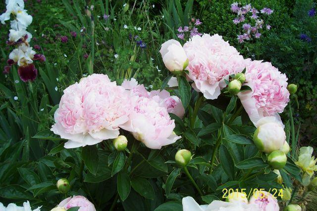 Alle Blüten im Vordergrund gehören zu `Mister Ed´, Klehm, 1980, egal ob rosa oder weiß. Wenn mich mein Schulenglisch nicht komplett verlassen hat, habe ich es so verstanden, dass sie aus einer Colchizin-Behandlung von `Monsineur Jules Elie´ hervorging. Besonders faszinierend finde ich die Blüten, mit einem Fetzen der jeweils anderen Farbe.